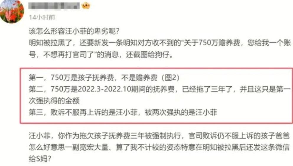 随后,汪小菲遭到了众多网友的吐槽,甚至形容他很“卑劣”,并表示,那笔钱是孩子的抚养费,而且已经整整拖了三年未付。