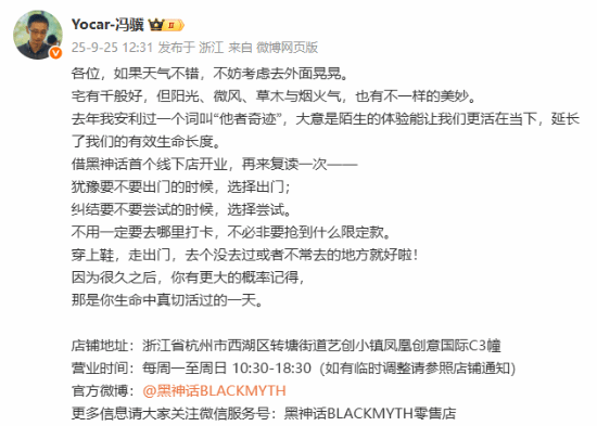黑神话的首家线下店铺“黑神话BLACKMYTH零售店”于今日开启试营业丰泰优配,地址在浙江省杭州市西湖区转塘街道艺创小镇凤凰创意国际C3幢,营业时间为每周一至周日10:30-18:30。同日,《黑神话》系列制作人冯骥在微博发文,安利了线下店铺,一起来看下。