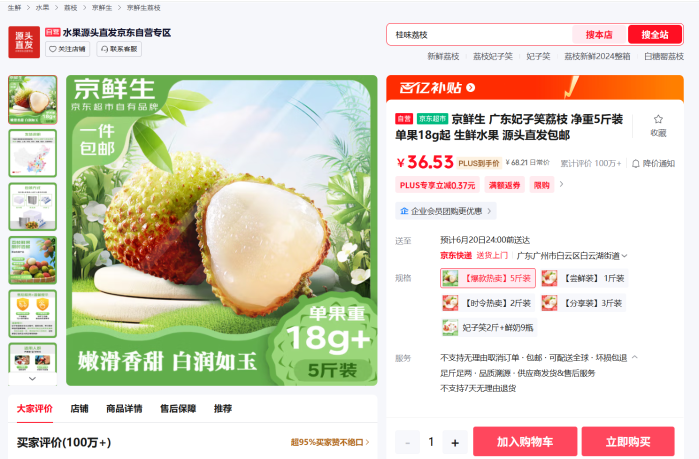 京东超市5斤装广东妃子笑荔枝包邮价仅36.53元